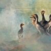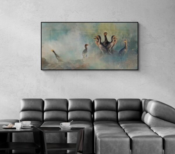 Cormorant Connection: In this impressive sea green work cormorants are resting on an island of mystique.