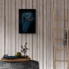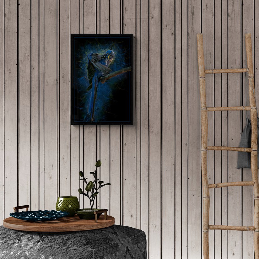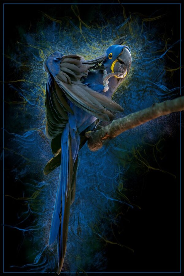 Ola: Can we ever know the thoughts of animals? Probably not. However, that does not stop us from commentating for our animals and children. This is a playful artwork with splashes of color highlighting this beautiful hyacinth (blue) macaw. Interesting tidbits about hyacinth macaw; they are a parrot native to central and eastern South America. There are only about 4,300 left in the wild. It takes seven years for them to reach sexual maturity which means recovery of their population is slow moving if we don’t protect these amazing creatures. Ola – awakening your imagination.