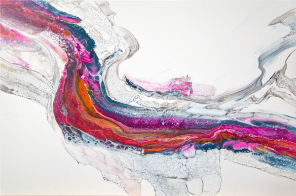 Fire Opal Flow: Opals grow by filling in cavities in the earth and sometimes take on the shapes of the space or the objects that surround them while buried in the ground. (IGS – International Gem Society) They are noted to be the stone of inspiration that enhances imagination and creativity. In this piece, “Fire Opal Flow”, the play of color, “or fire”, flows across the canvas in a kaleidoscopic display of yellows, oranges, and pinks with shifts of blue and veins of gold.